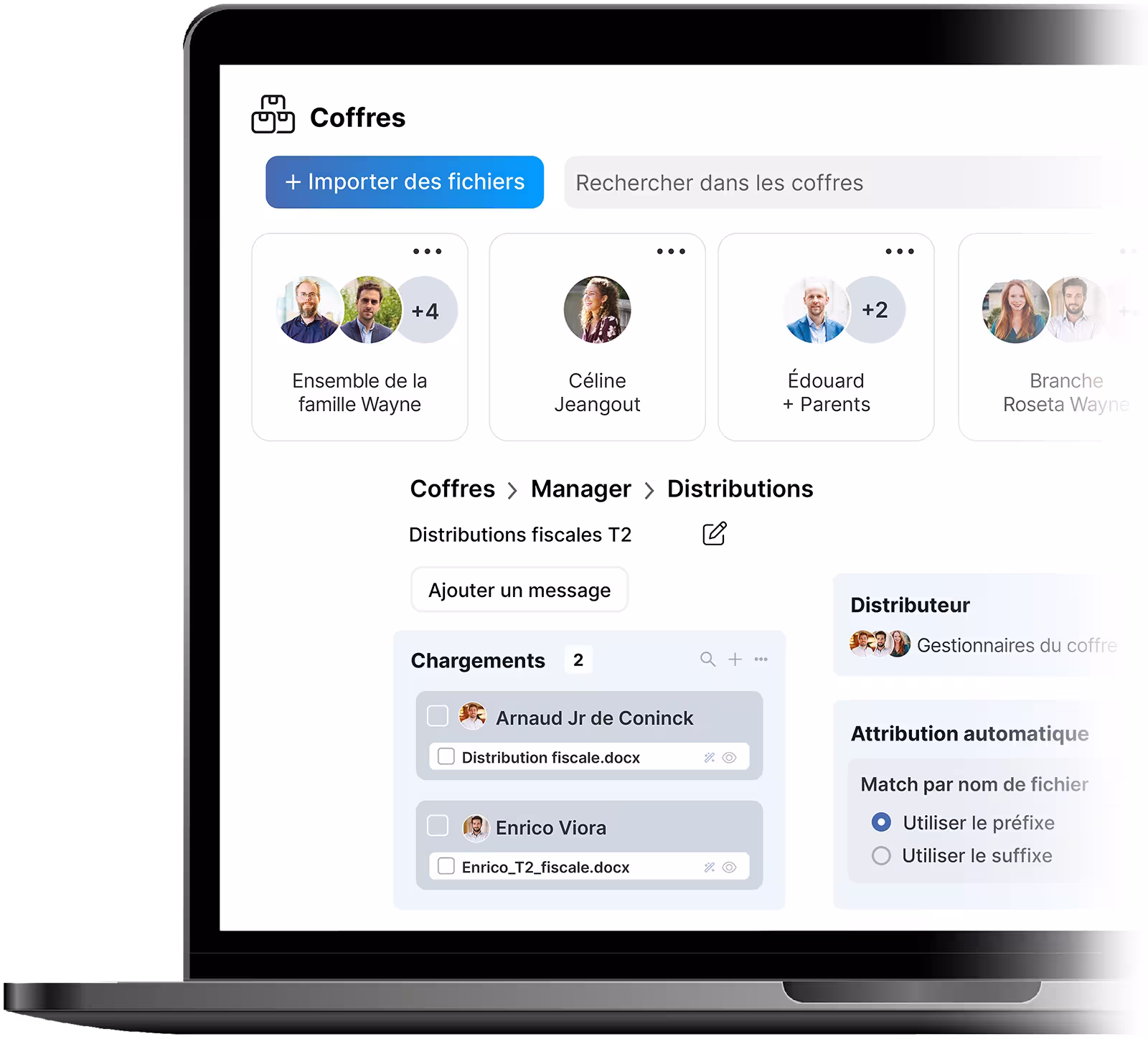 Distribuez en quelques clics de gros volumes de documents sensibles, tels que fiducies, ou déclarations fiscales, directement dans des coffres-forts sécurisés, pour les bons destinataires.
