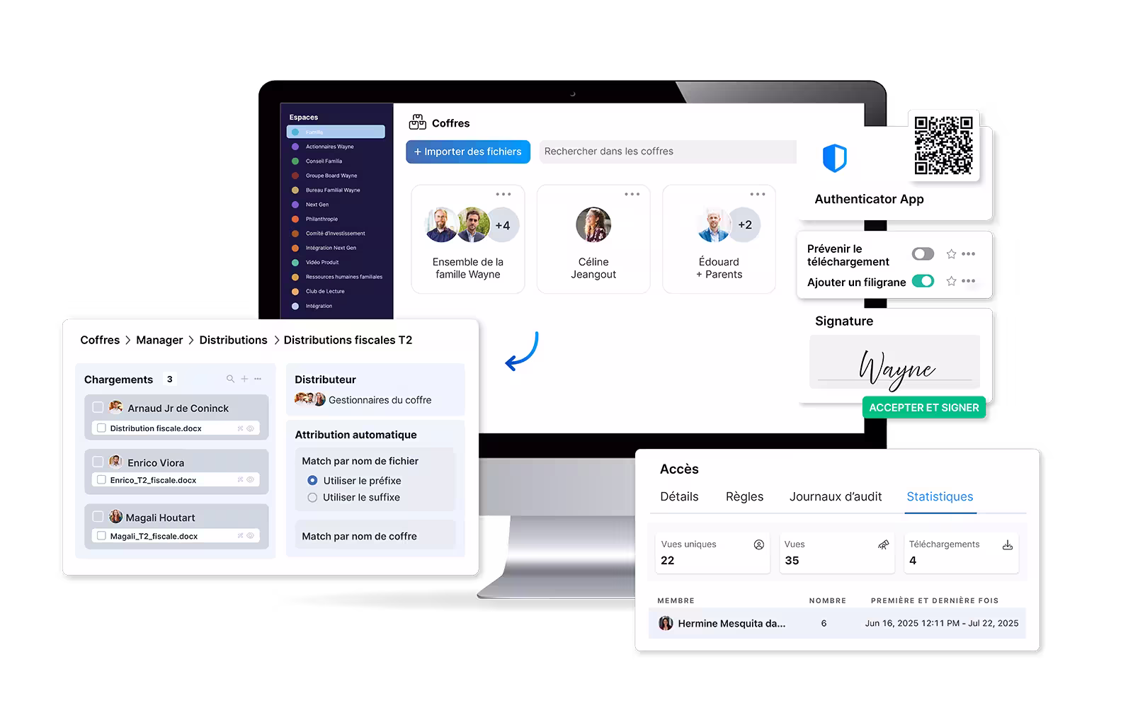 Les entreprises familiales manipulent des informations sensibles, et partager les bons documents avec les bonnes personnes devient critique. Les coffres-forts familyOS offrent un moyen sécurisé de distribuer des fichiers ultraconfidentiels, avec un contrôle clair des droits d’accès, de la visibilité et des relances.