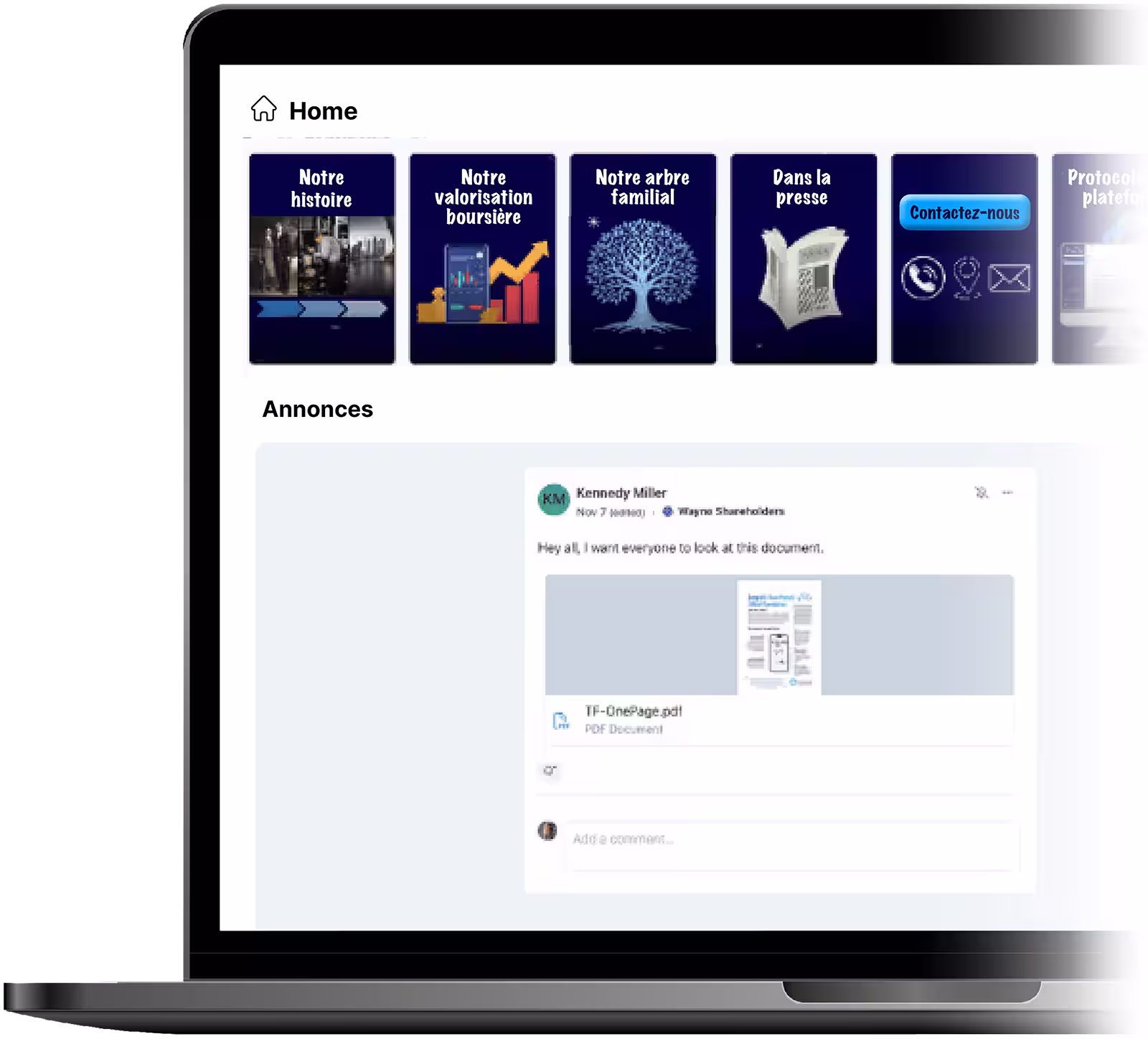 Créez des espaces dédiés pour le conseil de famille, le conseil d’administration, les actionnaires, les Next Gens ou encore les conseillers, afin que chaque groupe dispose d’un espace clair pour travailler, se réunir, partager des documents et consigner les décisions clés.